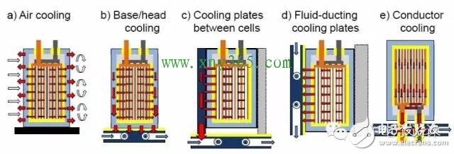 可能的热管理系统构型(这里分自然冷却、强制风冷、液冷、直接制冷剂冷却)