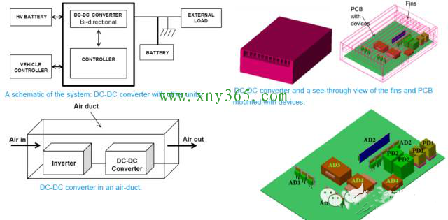 1)功率电子散热 在《Robust Thermal Design of a DC-DC Converter in an Electric Vehicle》中那样:在将工业的电气化移植入汽车中的过程中的时候,整个电子类产品的热设计(包括,电机,电机控制器,DC-DC高压转换和充电器,最为特殊的是电池组)这些部件的散热要求,需要结合考虑本身部件的布置的环境,然后根据这个环境条件来仔细考虑。在夏天高温环境下,汽车要承受地面高至40度以上的环境温度,还要把乘客舱的热量散出去,如果布置在底盘上的这些设备面临着系统性的热管理的风险。