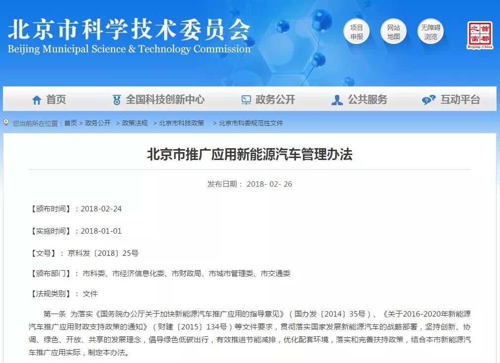 北京市科委网站2月26日发布了《北京市推广应用新能源汽车管理办法》(下称2018年办法),明确了北京新能源汽车推广的主要政策内容。