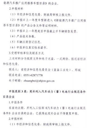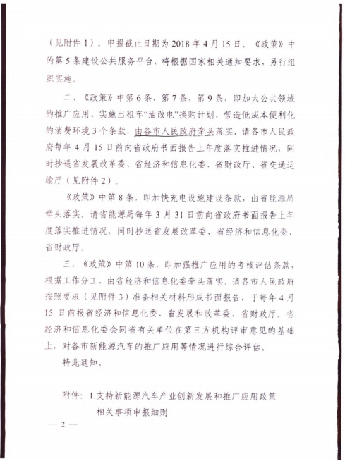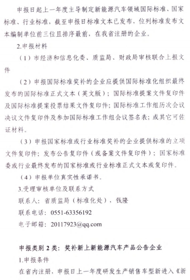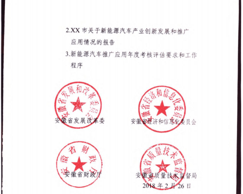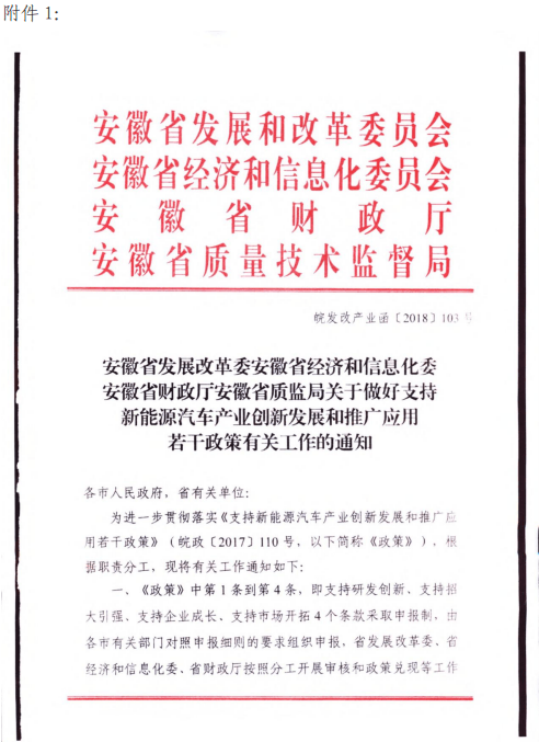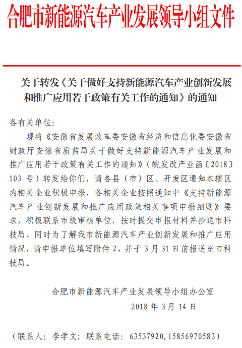 根据合肥市新能源汽车产业发展领导小组文件,现将《安徽省发展改革委安徽省经济和信息化委安徽省财政厅安徽省质监局关于做好支持新能源汽车产业发展和推广应用若干政策有关工作的通知》(皖发改产业函〔2018〕103号)转发给你们,请各相关企业按照通知中《支持新能源汽车产业创新发展和推广应用政策相关事项申报细则》要求,积极联系市级审核单位,按时提交申报材料并抄送市科技局,并填写附件2,并于3月31日前报送至市科技局。