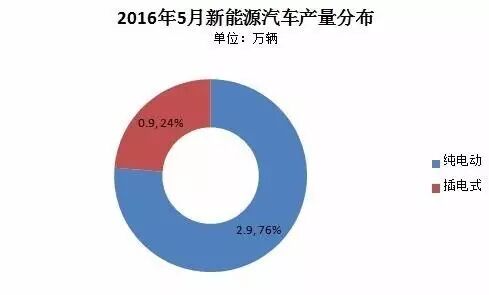 细分不同种类新能源汽车,纯电动车型依旧占据绝对主力,产量占比高达76%,而插电式混合动力车型产量仅占27%。与去年同期相比,纯电动车型产销量均保持在1.5倍以上的增幅,而插电式车型则保持在70%以下的增幅。具体而言,2016年5月纯电动汽车产销分别完成2.9万辆和2.6万辆,同比分别增长177.0%和161.6%;插电式混合动力汽车产销均完成约0.9万辆,同比分别增长49.3%和68.7%。