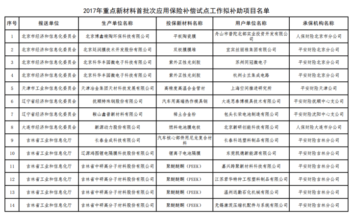 工信部公示2017年重点新材料首批应用保险补偿试点拟补助项目