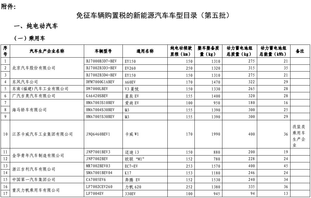 为促进我国交通能源战略转型、推进生态文明建设、支持新能源汽车产业发展,根据《财政部 国家税务总局 工业和信息化部关于免征新能源汽车车辆购置税的公告》(公告2014年第53号)的要求,工业和信息化部会同国家税务总局等部门对企业提交的申请材料进行了审查。现将《免征车辆购置税的新能源汽车车型目录》(第五批)予以公告。