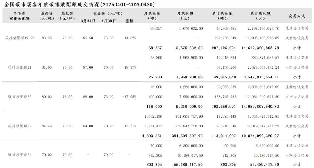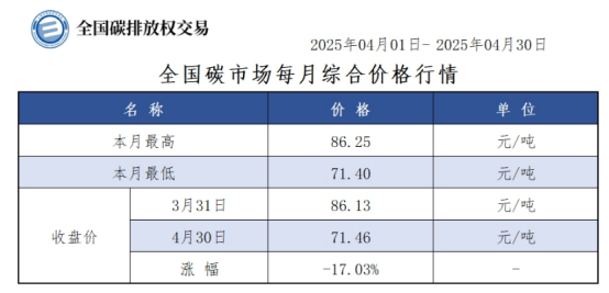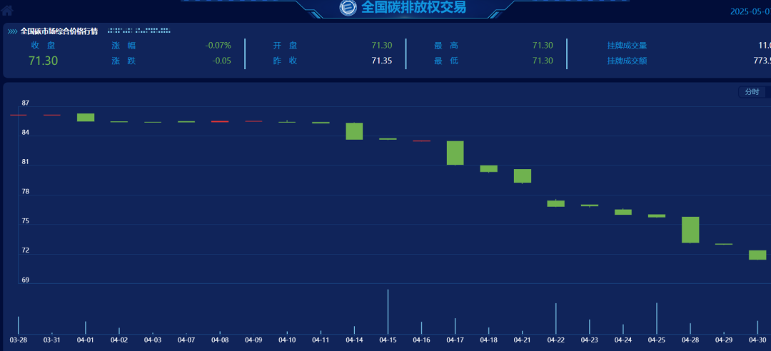 根据上海环境能源交易所数据,2025年4月全国碳市场综合价格呈现"三阶段"波动轨迹月初快速下探、中旬短暂企稳、下旬加速下行。