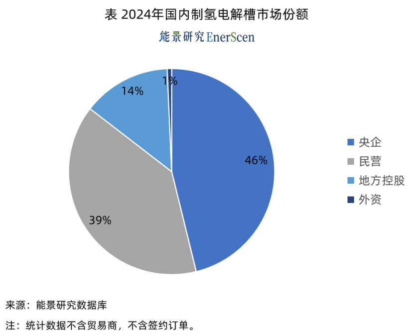 2024年,国内制氢电解槽市场份额中,央企及地方国企品牌市占率合计达到了约60%,民营品牌市占率降至约39%,外资品牌在市场上也开始有所表现。