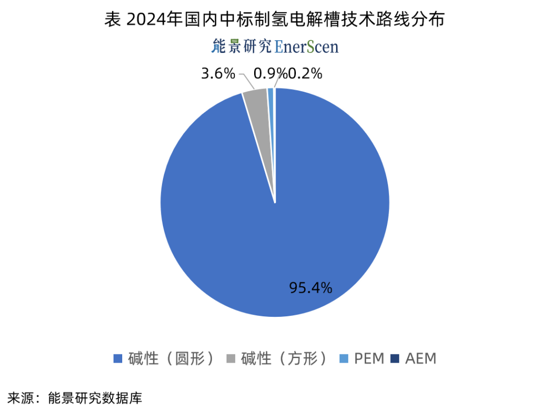 根据能景研究统计,碱性(圆形)目前仍是国内电解槽市场需求的主流。2024年,国内电解槽招投标及订单需求中,碱性(圆形)电解槽需求约占总需求的95%。