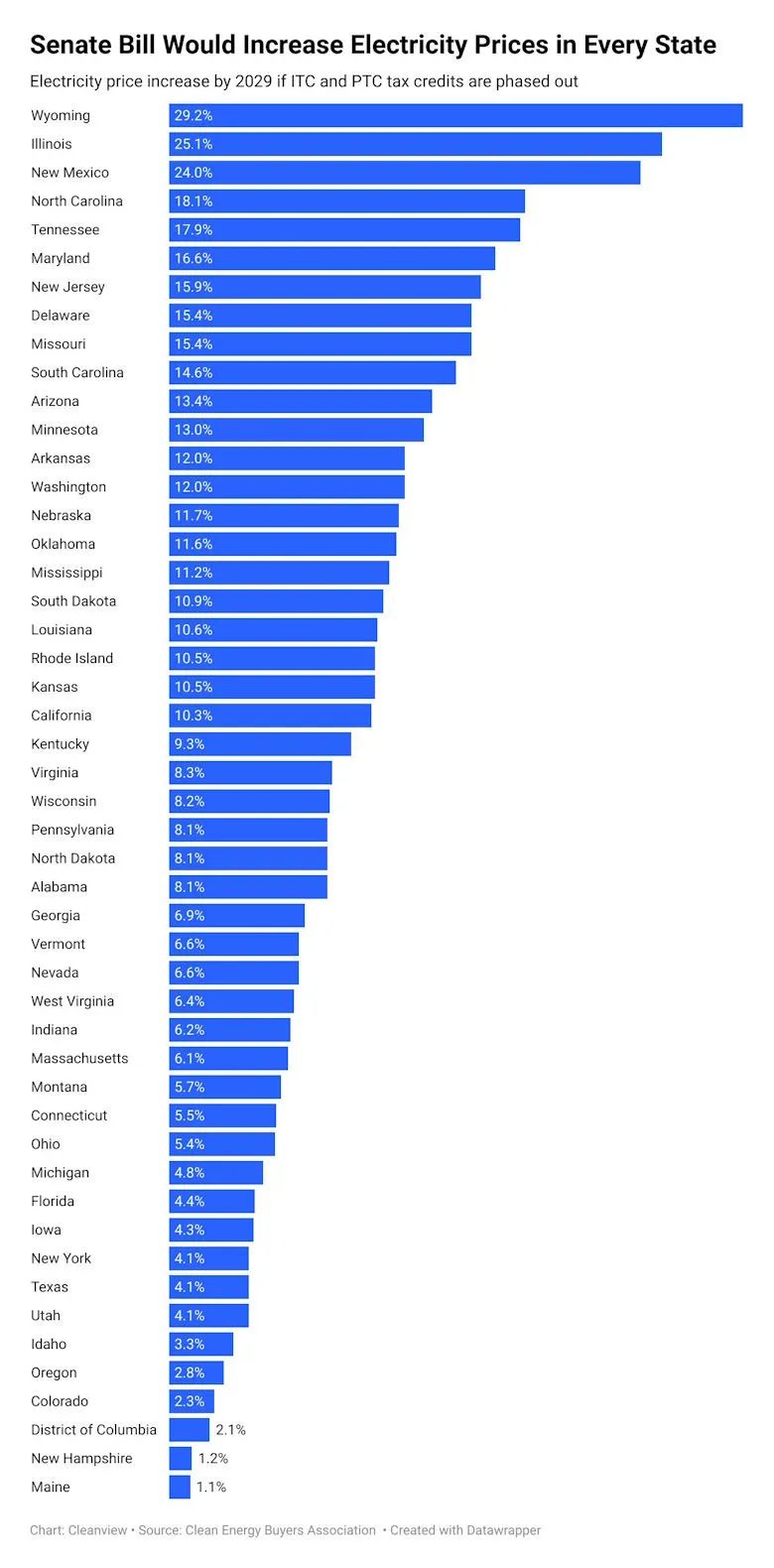 更致命的是,法案将核能源、地热能、电池储能一并纳入加税名单,却为出口至中国的炼钢用煤开绿灯。清洁能源数据公司 Clearview Energy 预测,这将导致美国 500GW 规划中的清洁能源项目流产 —— 相当于放弃 42% 的电力增长潜力,直接引发各州电费暴涨怀俄明州 2029 年电价或飙升 29.2%,德克萨斯州也将面临 4.1% 的涨幅。