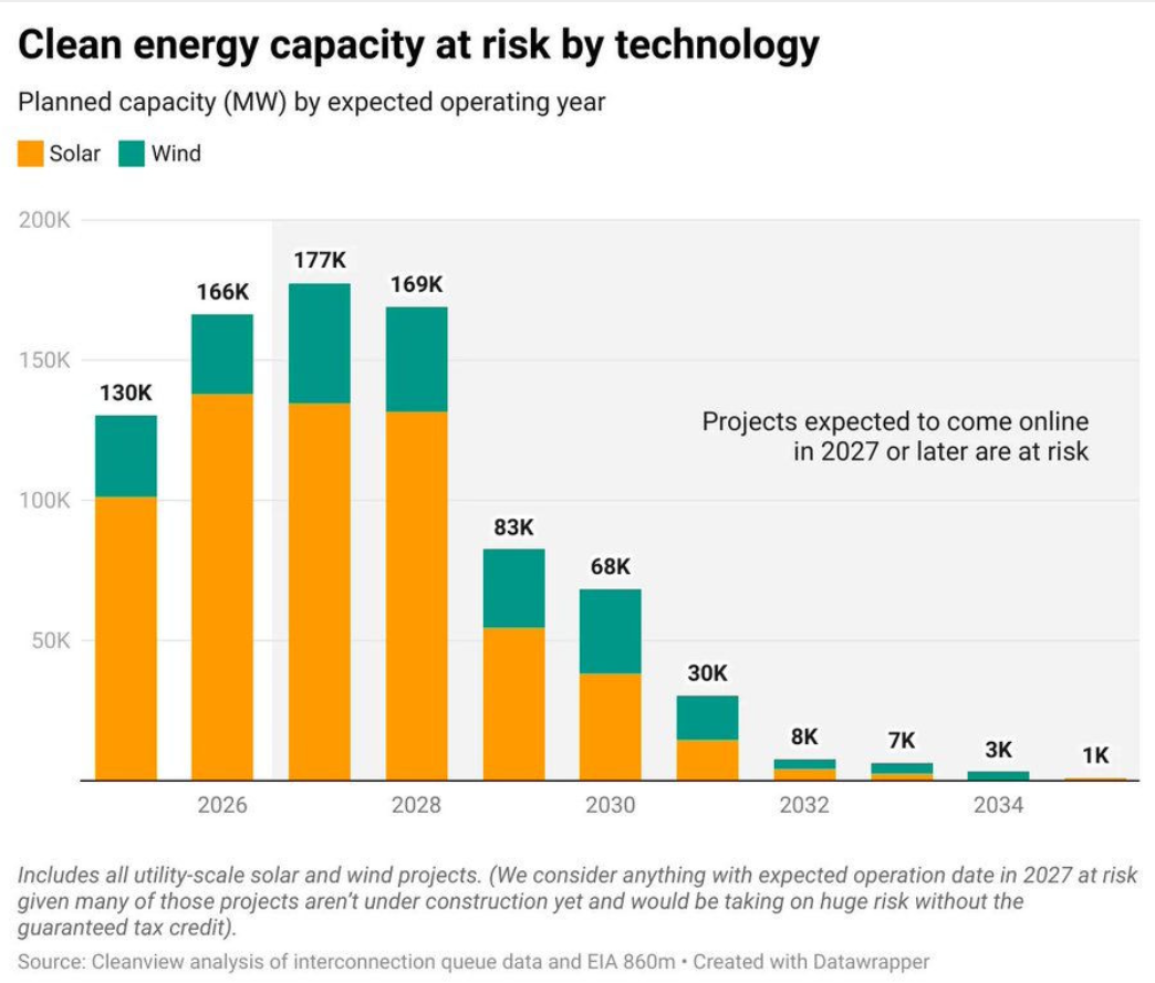 铑集团(Rhodium Group)分析显示,该法案将使风电和光伏项目成本再涨 10-20%,叠加取消 30-50% 的原有税收减免,整体税负增幅高达 40-70%。普林斯顿大学能源模型专家 Jesse Jenkins 的计算更触目惊心