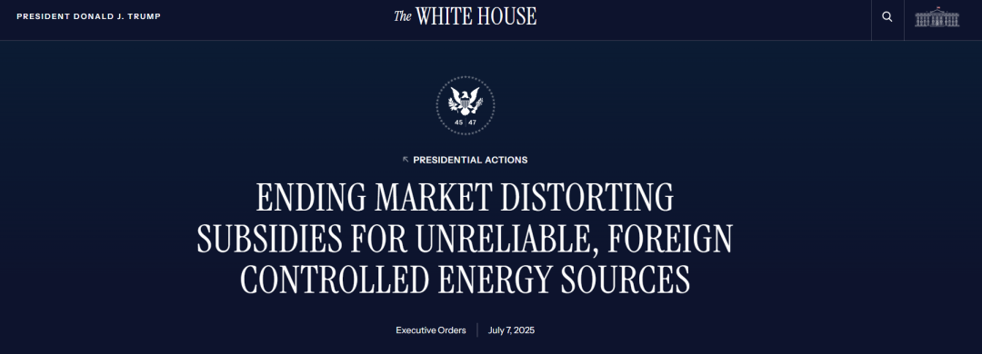 就在美国当地时间7月7日,白宫官网发布了特朗普最新签署的能源行政命令,该命令以所谓的"保护纳税人利益"和"确保能源安全"为名,对美国清洁能源产业实施了一系列严格限制措施。可以说这项行政令的出台,标志着美国能源政策在“大而美”法案出台之后,又一次发生了重大转向。