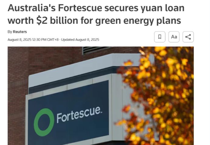 2025年08月23日关于澳大利亚矿企巨头获142亿人民币贷款,中澳绿色联盟挑战美国退出的空白的最新消息:“随着美国退出绿色技术投资,中国和Fortescue正在推进引领全球绿色工业革命所需的绿色技术。”撰文 |森序出品 | 零碳知识局近日,澳大利亚铁矿石巨头F
