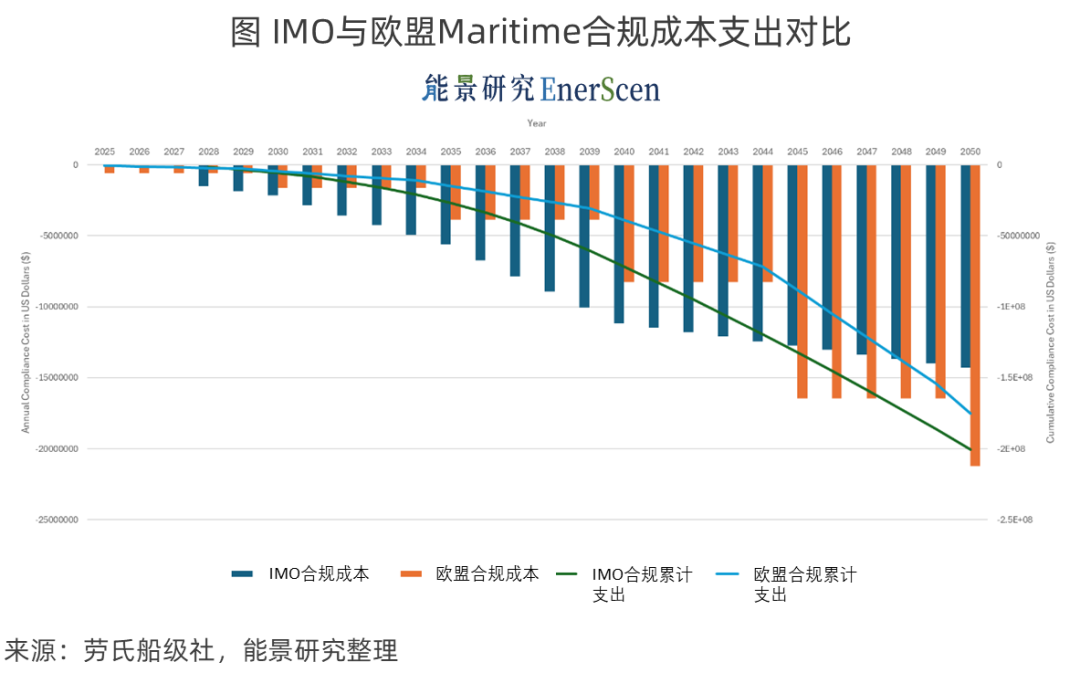 欧盟率先推出强制性政策,一是在2024年正式将航运业纳入排放交易体系(EU ETS),二是在2025年奖惩政策《FuelEU Maritime》正式生效,超出碳排强度标准的部分油耗,将面临最高2400欧元/吨的罚款——构成了双轨并行的监管体系。