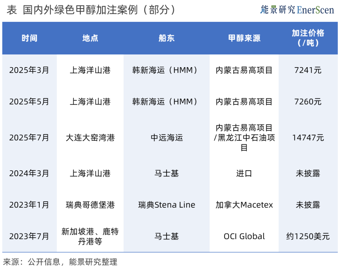 从加注价格看,高“溢价”现象普遍存在。据荷兰燃料供应商OCI Global披露,2023年其为马士基提供的绿色甲醇价格高达约1250美元/吨。另据公开信息,2025年国内上海洋山港绿色甲醇加注价格平均约在7200元/吨左右;在吉林等地的加注案例则可高达1万元/吨以上。