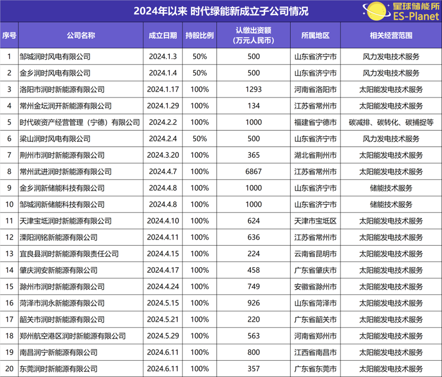 参考星球储能所此前统计显示,仅去年上半年(截至2024年6月11日),时代绿能新成立的风、光、碳领域新能源子公司就有20家之多,多数分布在东部沿海地区。