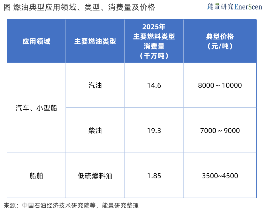 在汽车、中小型船舶等领域,对于污染物排放等有着较高约束,主要采用低排放的汽油、柴油。国内每年消耗汽油、柴油分别接近1.5亿吨与2亿吨。其中汽油价格较高,约8000 ~ 10000元/吨;柴油价格相对较低,约7000 ~ 9000元/吨。