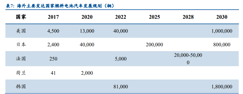 世界主要发达国家积极推进氢能和燃料电池产业发展。日本、美国、韩国、欧洲等国家 氢燃料电池汽车的研发与商业化应用发展迅速,各国均制定了燃料电池行业中长期发展规划并 投入巨额补贴,日本由于其自身的资源匮乏,甚至将发展氢能和燃料电池技术提升到了国家战 略层面。