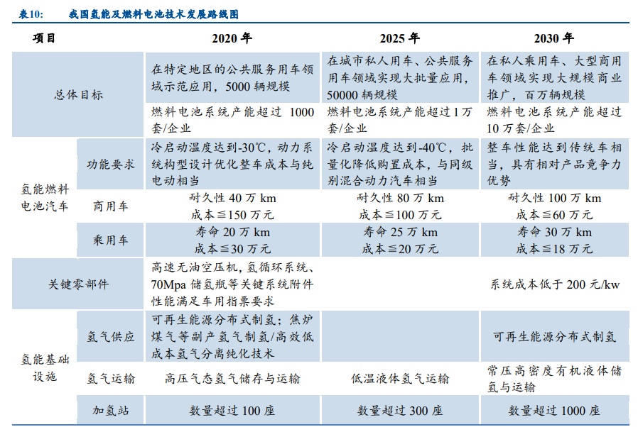 我国规划到 2030 年燃料电池汽车保有量达到 100 万辆。根据中国《节能与新能源汽车产 业技术路线图》,到 2025年氢燃料电池汽车保有量推广规模将达到 5万辆,其中商用车 1万辆、 乘用车 4 万辆,加氢站超过 300 座。2030 年,将实现大规模商业化推广累计 100 万辆,燃料 电池系统产能超过 10 万套/企业,整机性能达到与传统内燃机相当。
