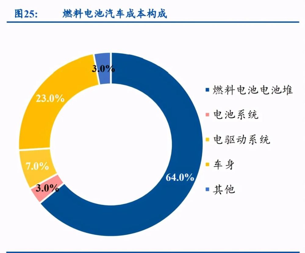 燃料电池成本是限制燃料电池汽车行业发展速度的主要因素,当前燃料电池汽车产业链 各个环节成本构成如下: