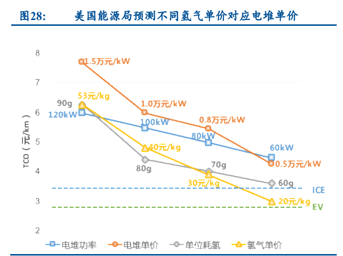 氢燃料电池汽车能源使用成本略高于传统燃油车,随着制氢成本下降有极大下降空间。 以目前氢燃料约 70 元/kg 的售价、百公里消耗 0.8kg 计算,氢燃料电池的能源使用成本为 56 元/100km,按 6.7 元/L 的汽油价格、8L/百公里测算,燃油车能源使用成本为 53.6 元/100km, 氢燃料电池能源使用成本略高于燃油车,有较大下降空间。预计几年后氢燃料电池的使用成本 就将低于燃油车,全生命周期成本的比较主要将取决于购置成本。