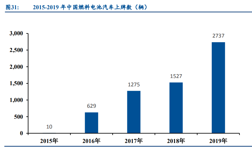 2015-2019 年我国燃料电池汽车产量在政策扶持下迎来快速增长。2015 年,我国燃料电 池汽车上牌数仅 10 辆,在燃料电池汽车补贴政策的带动下,过去四年行业产销量迎来高速增 长,2019 年我国燃料电池汽车上牌数达到 2737 辆,同比增长 79%。我国燃料电池汽车产业已 经由过去政府主导的技术探索、示范运营阶段,逐步过渡到商业化初期阶段,预计今年及“十 四五”期间燃料电池汽车仍将延续快速增长态势。