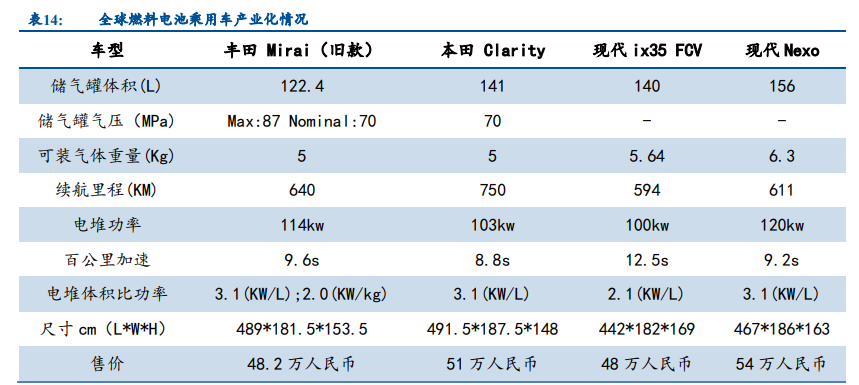 ? 燃料电池汽车整车:1)当前在售燃料电池乘用车为 45-50 万元/辆。2)当前在售燃 料电池商用车为上百万/辆。