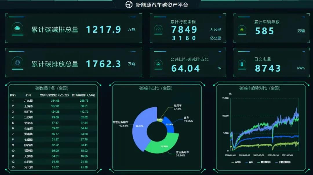 该平台通过新能源汽车实际运行里程、充电量等数据直观展示了全国新能源汽车累计碳减排和碳排放现状,更结合各省份新能源汽车实际运行情况,梳理出各省份不同营运类型新能源汽车运行碳足迹,该平台的发布将对各地区政府部门开展新能源汽车推广、探索碳数据计量具有重要的参考意义。