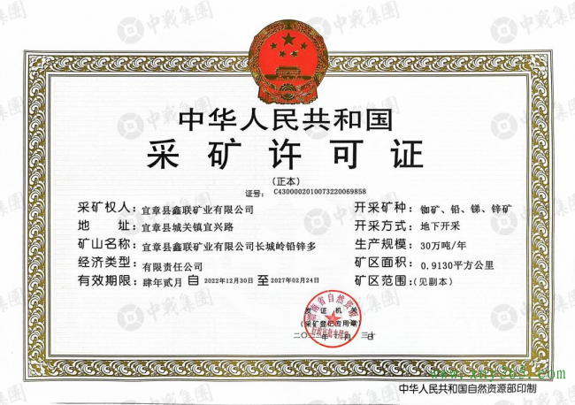 2023年1月3日,中战集团旗下宜章县鑫联矿业有限公司长城岭铷铅锌锑多金属矿,获得由国家自然资源部备案,湖南省自然资源厅颁发的《中华人民共和国采矿许可证》新证,这是全国颁布的首张铷矿种《采矿权证》,对未来加快推动稀有金属铷材料在我国新能源、新材料领域的应用从而进一步保障国家能源安全、推动国家能源转型、筑牢国家能源安全“闸门”方面具有重要战略意义。