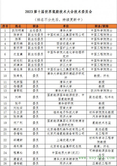 WHTC2023技术委员会由欧阳明高院士担任主任委员,陈学东、陈军、郭烈锦、彭苏萍、衣宝廉、邹志刚、郑津洋、谢在库等8位院士担任副主任委员。此外,国际氢能协会副主席毛宗强教授,加拿大工程院院士王海江、叶思宇、欧洲科学院院士唐军旺等近70位业界领军学者、专家出任委员,阵容强大。