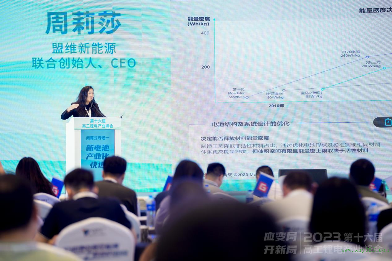 在“新电池产业化快进”闭幕式专场上,盟维科技联合创始人、CEO周莉莎女士应邀发表“锂金属电池产品开发现状及应用前景”主题演讲,与行业专家分享盟维科技在锂金属电池产业化方面的探索与思考。