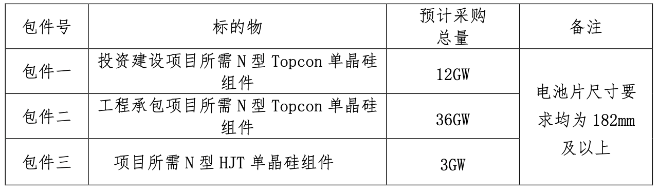 其中,包件一和包件二分别采购12GW和36GW TOPCon组件,采购总量48GW,包件三采购3GW HJT组件。电池片尺寸要求均为182mm及以上。
