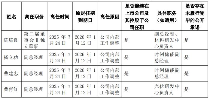 7月25日,时创能源公告称,公司于2025年7月24日收到公司非独立董事陈培良先生、副总经理杨立功先生、曹建忠先生和曹育红女士的辞职报告。