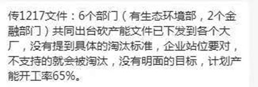 一则小作文称传1217文件6个部门(有生态环境部,2个金融部门)共同出台去产能的文件已下发到各个大厂,没有提到具体的淘汰标准,企业要明确站位,不支持的就会被淘汰。没有明面上的目标,计划产能开工率为65%。