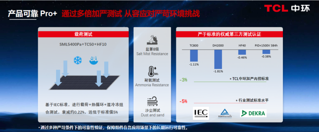 经过远超行业标准的数倍严苛测试,T5 Pro成功通过盐雾8级、耐氨腐蚀以及沙尘侵袭等多项严苛测试,性能卓越;在SML5400Pa载荷、TC50热循环与HF10湿冷冻复合测试中同样表现优异,衰减率仅约0.22%,远超行业5%的标准要求。