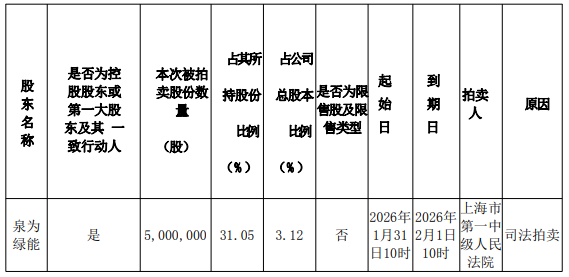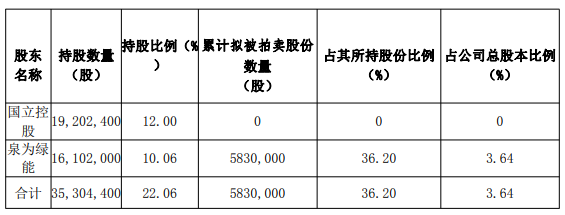 2、本次司法处置标的为公司控股股东泉为绿能持有的公司5,000,000股股份,占公司股本的3.12%。若本次司法拍卖成交并过户登记,泉为绿能持股将由16,102,000股减少至11,102,000股,占公司股本的比例将由10.06%降至6.94%。