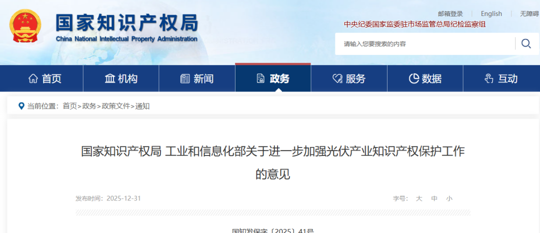 2025年12月31日,国家知识产权局与工业和信息化部联合发布《关于进一步加强光伏产业知识产权保护工作的意见》(国知发保字〔2025〕41 号)。