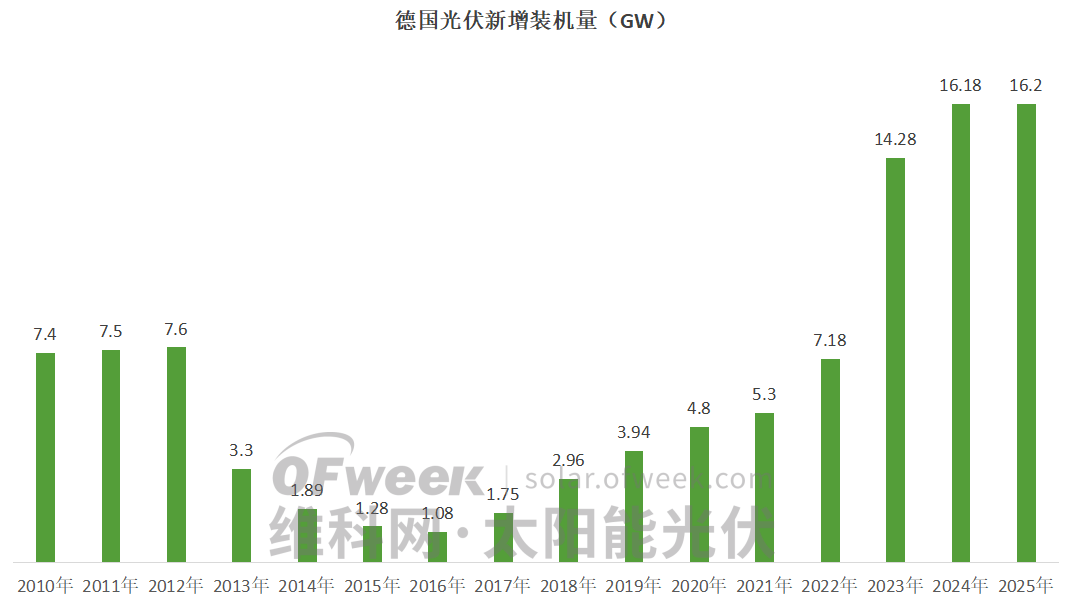 2026年01月07日关于16.2GW!超额完成目标!德国光伏装机持续火爆的最新消息:维科网光伏讯,弗劳恩霍夫太阳能系统研究所(ISE)基于energy-charts.info数据平台的分析显示,2025年德国安装了16.2GW的太阳能光伏发电系统,与2024年新增