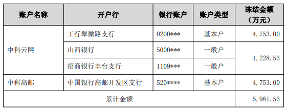 12月31日,中科云网发布关于公司及控股子公司银行账户被冻结的公告。公司及控股子公司中科高邮获悉,公司及子公司部分银行账户被查封及冻结,累计金额5,981.53万元。具体情况如下