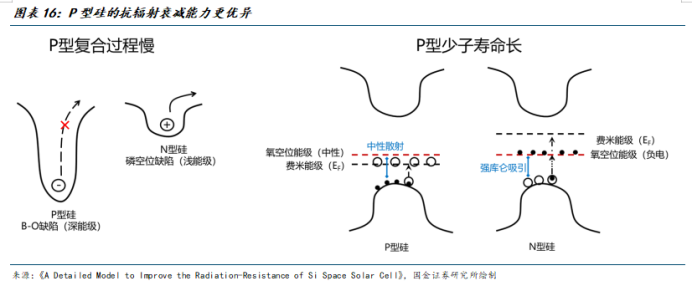 在传统的晶硅电池领域,P型晶硅电池在太空应用场景下具备更强的抗衰减性,而从具体的路线看,P-HJT(异质结)的电池效率较高,且其薄片化特点能更好的满足太阳翼柔性与抗衰减的需求。