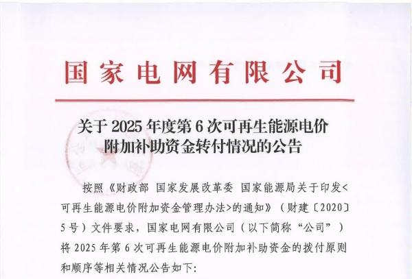 2月24日,国网新能源云平台挂出一则公告,2025年第六次可再生能源电价附加补助资金转付完成,其中太阳能发电拿走86.35亿元。这是2025年财年最后一次结算,也是新能源全面入市前最大规模的一笔“政策性输血”。