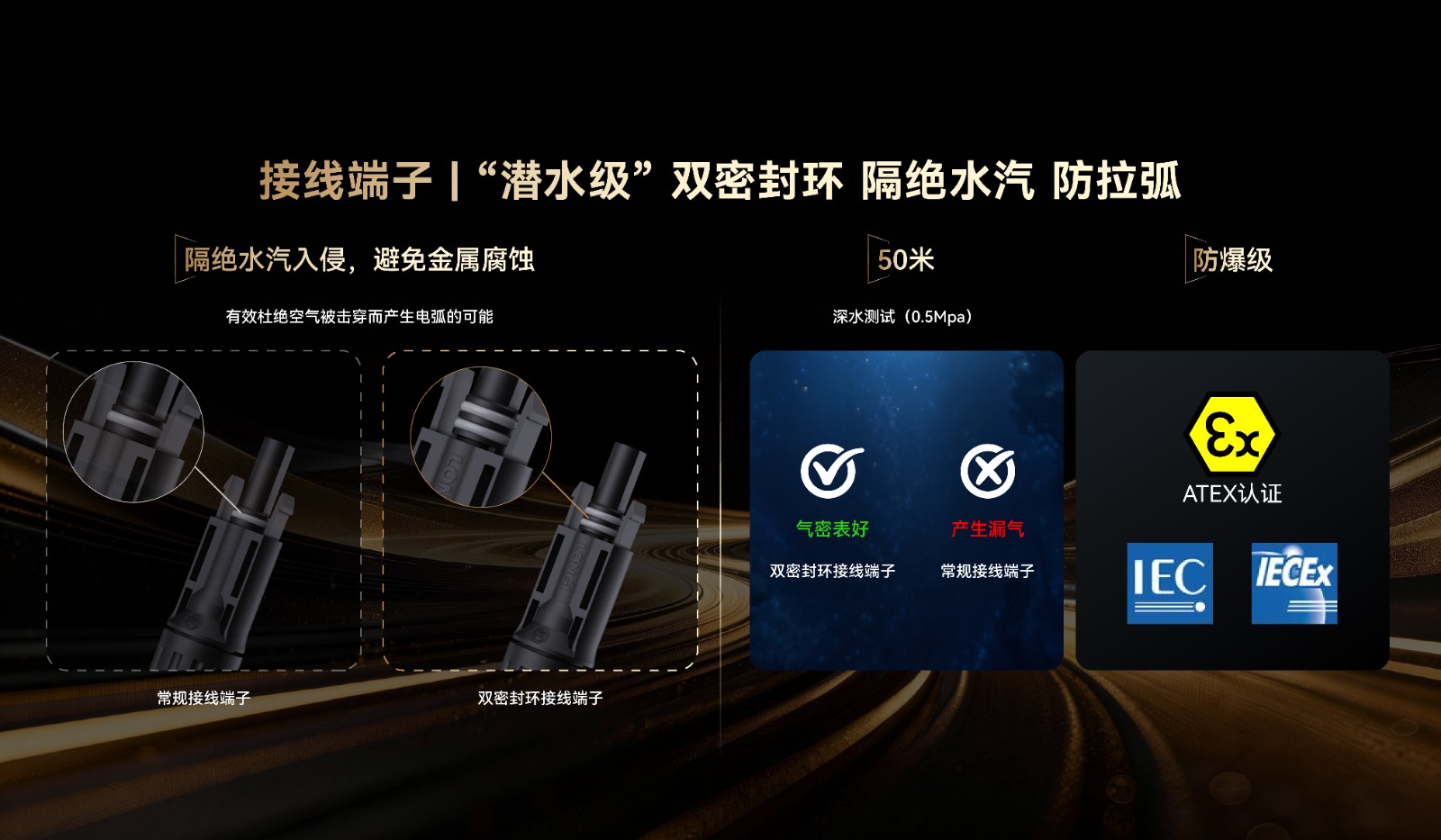 “潜水级”双密封环传统连接器单层密封易受水汽腐蚀,导致接触不良引发拉弧。隆基首创双密封设计,给接头穿上了“潜水服”,在0.5MPa(相当于水下50米)的极端水压下依然保持完美气密性。有效杜绝高湿度、高酸碱环境下的金属氧化,从物理上杜绝空气击穿。