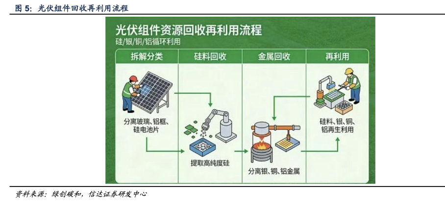 上游制造业的门槛被抬高了。《意见》明确要求光伏组件生产要采用易拆解、易分离的胶粘材料,选用无氟背板、无铅焊带等绿色原材料。可回收性成了产品设计的硬指标,谁先掌握绿色设计和再生材料应用,谁就能拿到下一轮的入场券。