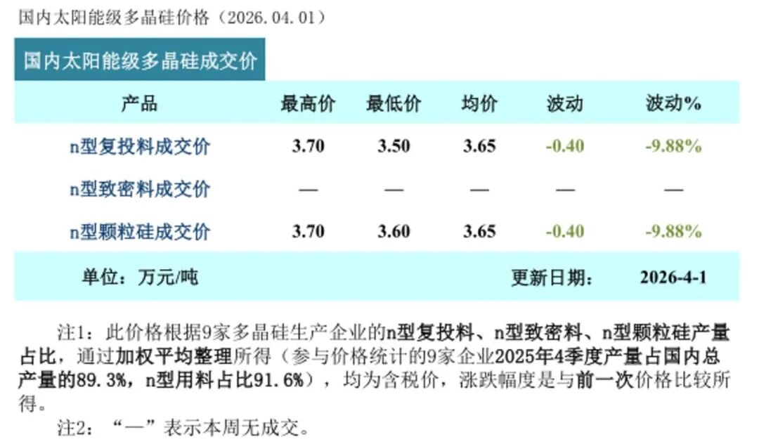 硅业分会4月1日发布的每周数据显示,n型复投料均价为3.65万元/吨,InfoLink同期的周报显示n型致密料均价为3.7万元/吨。