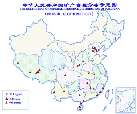 中国地热资源按其属性可分为三种类型:①高温(>150℃)对流型地热资源,这类资源主要分布在西藏、腾冲现代火山区及台湾,前二者属地中海地热带中的东延部分,而台湾位居环太平洋地热带中。②中温(90~150℃)、低温(<90℃)对流型地热资源,主要分布在沿海一带如广东、福建、海南等省区;③中低温传导型地热资源,这类资源分布在中新生代大中型沉积盆地如华北、松辽、四川、鄂尔多斯等。这类资源又往往跟油气或其他矿产资源如煤炭等处在同一盆地之中。上述三类地热资源分布在我国不同地区,并与该地区的地质-构造背景密切相关。